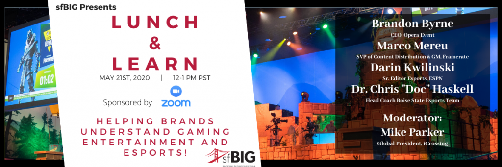 Join us for another amazing Lunch & Learn on Thursday, May 21st from 12 – 1 pm PST. Gaming has overtaken the entertainment world and yet very little is understood about how gaming and entertainment interact. Programs like esports and gaming entertainment are in their infancy, but the audience is massive. In this panel, learn exactly how gaming intersects with entertainment; how esports fits into the mix; how brands can get involved in meaningful ways; and learn what’s coming next.